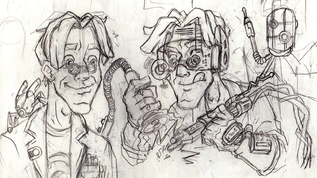 When Joel started drawing Dr. Everett in his style, he decided to incorporate some of his own father in the sketches. He put some of his Dad’s mannerisms into the character, such as his tongue sticking out when he would be focused on something. You can see some of these physical mannerisms in the pages of the comic and in the early sketches by Joel seen below: